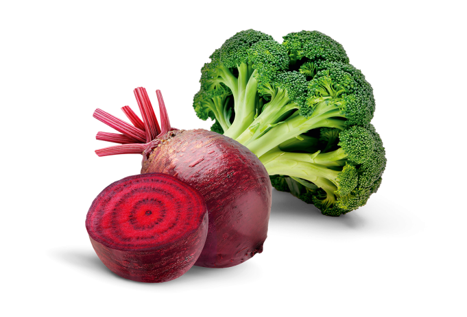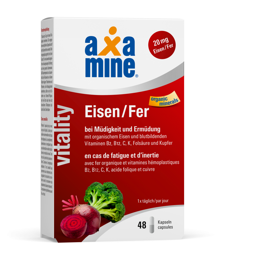 Gelatine, Gemüsepulver aus Broccoli 16% und Randen (rote Beete) 16%, Eisen-IIgluconat, Vitamin C, Eisen-II-fumarat, Trennmittel: Tricalciumphosphat; Inulin, Vitamin B12, Vitamin B2, Vitamin K1, Folsäure, Kupfersulfat, Trennmittel: Magnesiumsalze der Speisefettsäuren; Farbstoff: Eisenoxide.